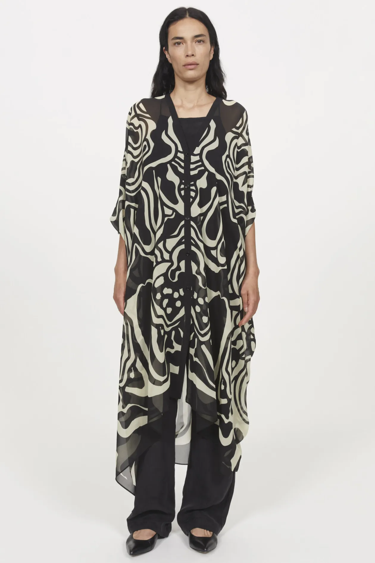 Rodebjer’S Exclusive Cosmic Bloom Print Swirls Across The Flowing Agave Caftan. Made From Lightweight Silk Georgette, This Oversized Style Fastens With A Strip Of Buttons At The Front, And Drapes Down The Figure From Its Sharp V-Neckline To Its Gathered, Asymmetrical Hemline.