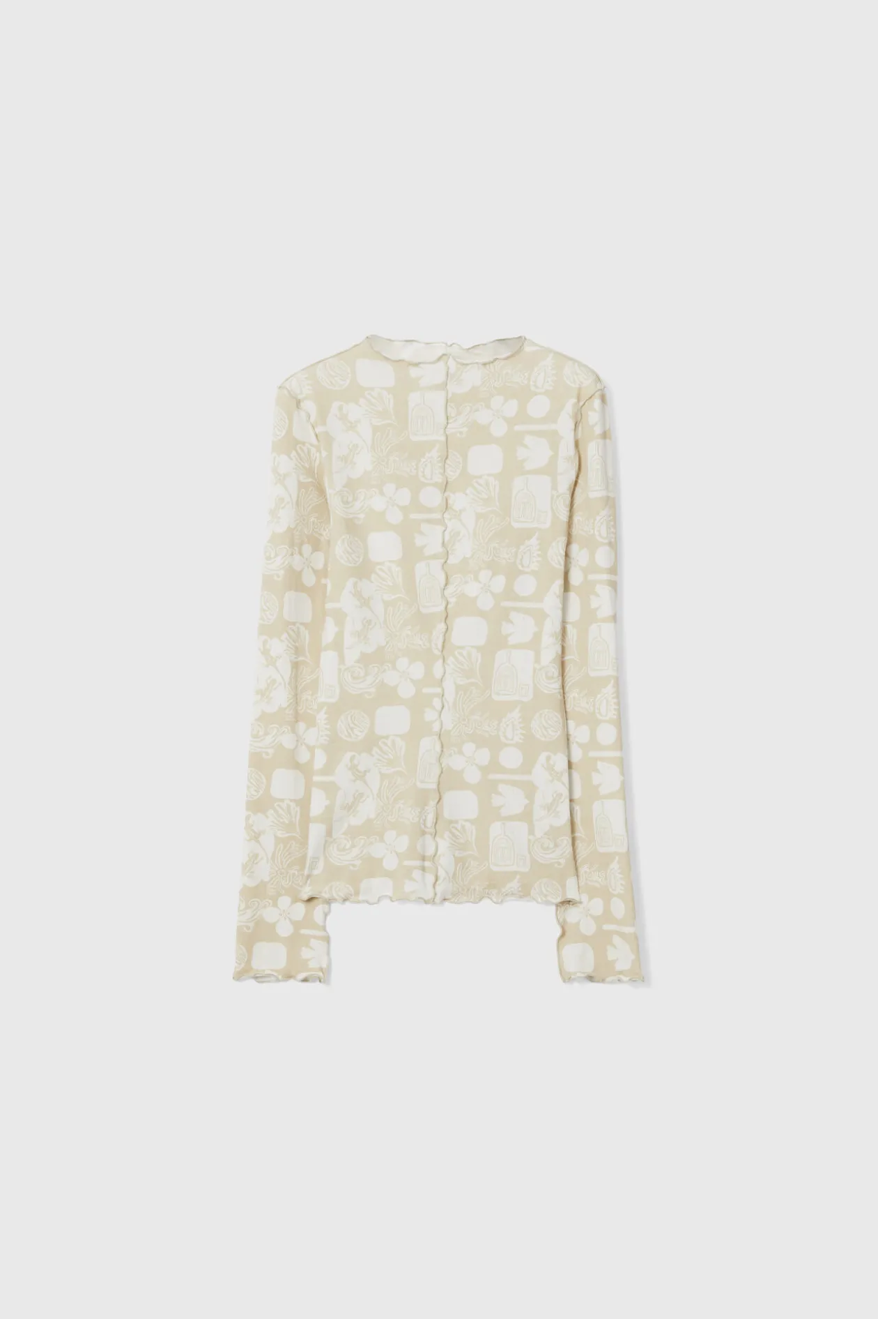 Made From Lightweight Organic Cotton Jersey, The Columbina Top Showcases A Beige And White Rendition Of The Surrealist Sketchbook Print. This Long-Sleeved Style Is Detailed With Lettuce Edging At The Neckline, Sleeves, Hemline And Center Front For Added Interest.