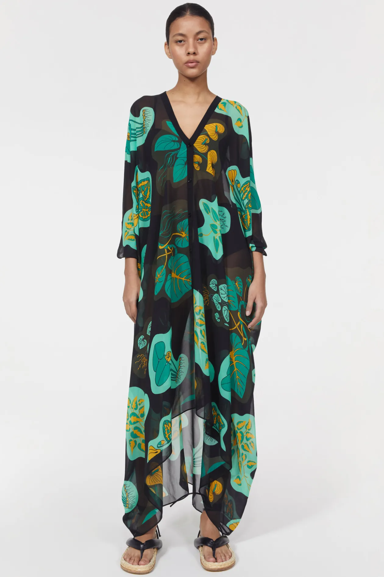 Rodebjer’S Exclusive Heartleaf Print Is Seen Across The Flowing Agave Caftan. Made From Lightweight Silk Georgette, This Oversized Style Fastens With A Strip Of Buttons At The Front, And Drapes Down The Figure From Its Sharp V-Neckline To Its Gathered Asymmetrical Hemline.