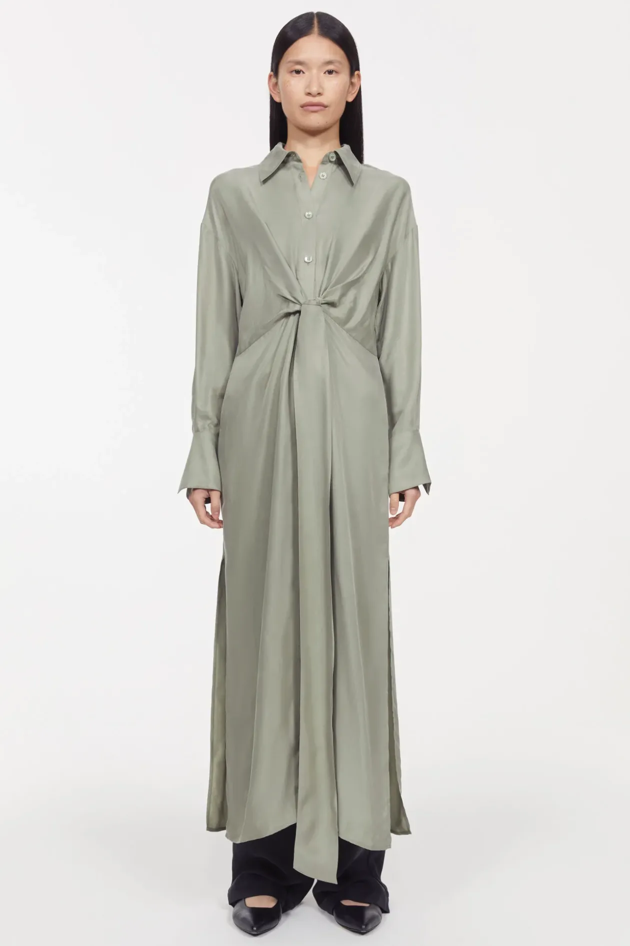 A Study In Soft Contrasts, The Apple Peach Design Is A Shirt Dress That Is Crafted From Sandwashed Twill That Ensures A Luxurious Handle. The Long-Sleeved Style Has A Classic Button-Down Front, And Self-Fastening Ties At The Waist That Create An Artful Gather Below The Bust. Wear Yours With A Pair Of Pointed Flats.