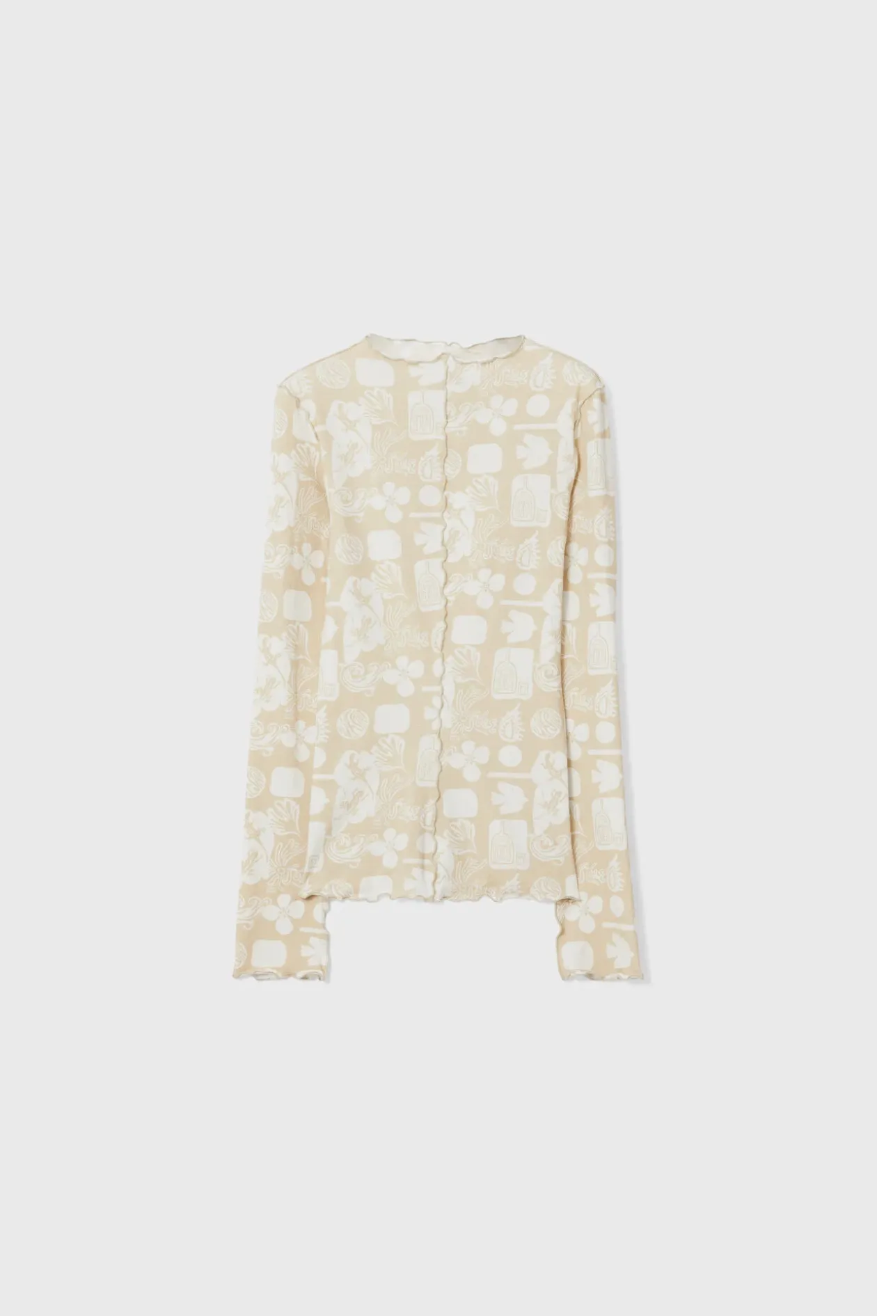 Made From Lightweight Organic Cotton Jersey, The Columbina Top Showcases A Beige And White Rendition Of The Surrealist Sketchbook Print. This Long-Sleeved Style Is Detailed With Lettuce Edging At The Neckline, Sleeves, Hemline And Center Front For Added Interest.