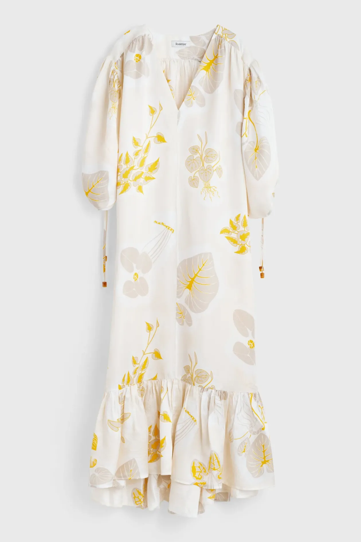 An Exploration Of Artistic Details, The Voluminous Dakota Dress Is Made From A Hammered Blend Of Viscose And Silk. Illustrated With Rodebjer’S Heartleaf Print, The Design Is Shaped With Dropped Shoulders, And An Asymmetrical Hemline That Is Framed With A Frill. Decorative Beading Dangles From The ¾ Sleeves As A Final Expressive Touch.
