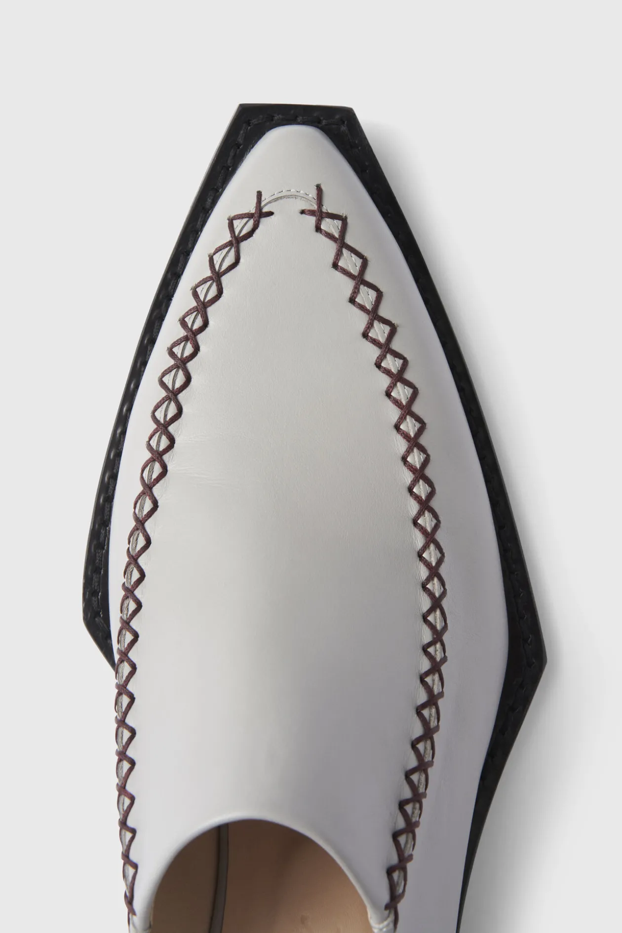 Drawing Inspiration From Both Cowboy Boots And Traditional Swedish Beak Boots, Klinte Is A Minimalistic Slip-On Mule Crafted In Smooth Leather. The Mules Are Embellished With Cross Stitch Detail Bordering The Square-Tipped Pointed Toe.