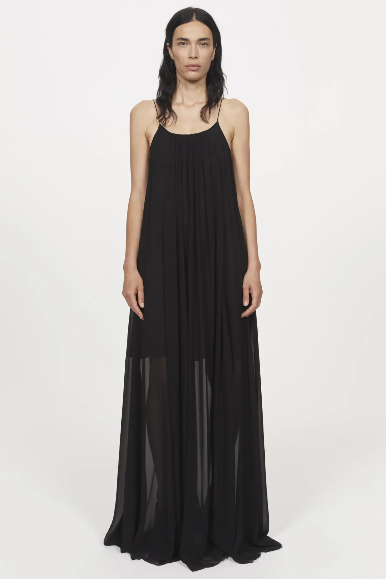 Hanging From Slender Straps, The Solin Is Designed With Ease Of Movement In Mind. Presented In Timeless Black, It Is Made From Fsc-Certified Viscose Chiffon That Falls Down The Figure To Full Gathers, And Is Detailed With Raw Edging At Its Maxi-Length Hemline.